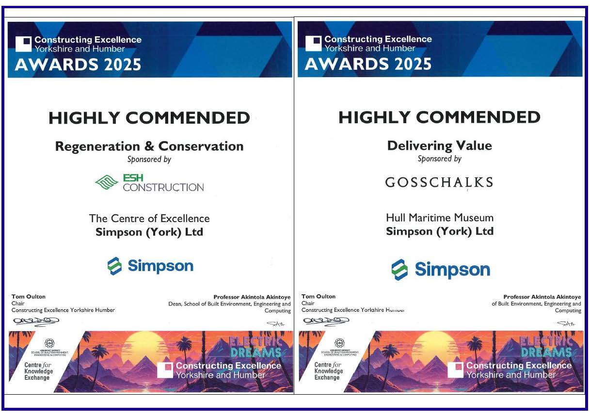Simpson are thrilled to receive not one but two 'Highly Commended' awards, Delivering Value, for Hull Maritime Museum and Regeneration & Conservation for York Minster (Chapter of York) Centre of Excellence. A big thanks to everyone involved in both projects.