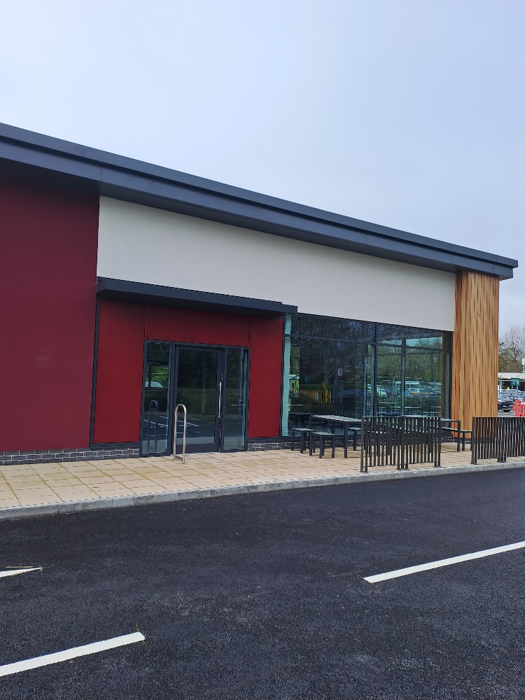 The works completed over a 22week program consisted of concrete strip and pad foundations, steel frame, composite roof, block cavity envelope with render panels and cedar columns, aluminium soffits and rain water goods, new car park drive through lighting, new electric and water supply, offsite connections to all new stats, extensive new deep drainage works, new tarmac works around the new building including drive through and making good new white lining and soft landscaping works