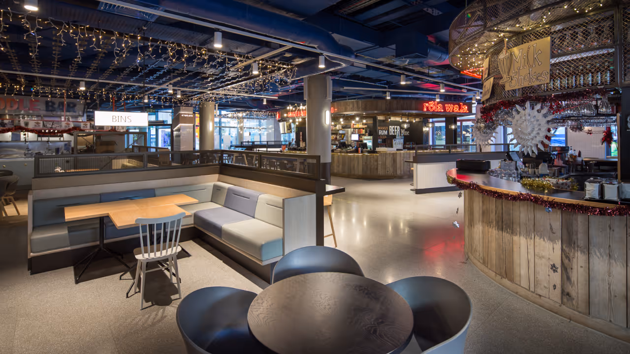 Phase one involved the internal fit-out of the new Social Area. This included mechanical, electrical and sprinkler installations, along with new partition walls, ceilings and ceramic wall and floor finishes. Our in-house joinery workshop also manufactured bespoke furniture, such as benches, community tables and fixed booth seating.